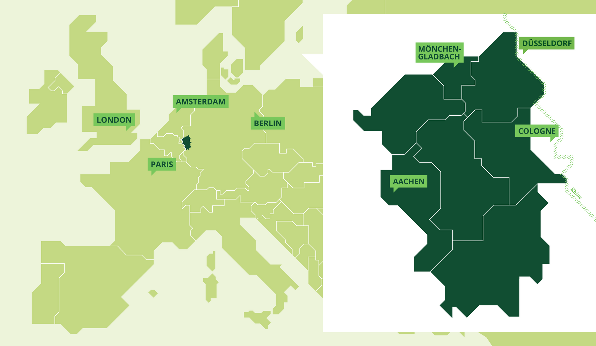 The rhenish area is spread between the cities of Duisburg, Düsseldorf, Cologne & Aachen. The proximity to it`s european neighbours The Netherlands, Belgium and France facilitate cross country business making. Within a radius of 60 km, there are plenty of universities and technical training institutions which empowers the workforce of that region.